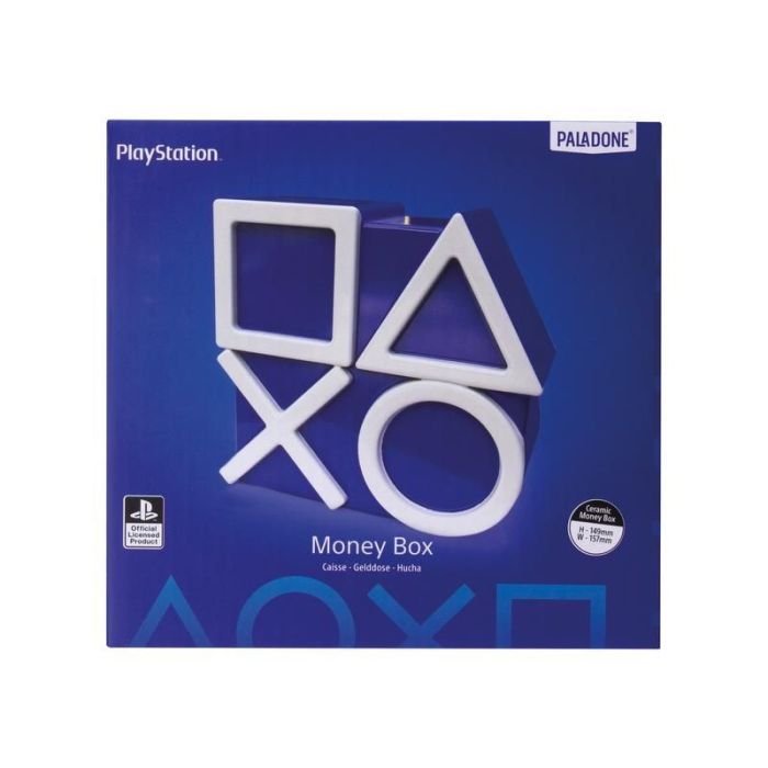 - Designed in colours inspired by the awesome PlayStation 5, this super cool blue and white ceramic money box stands 15cm (5.9 inches) tall. Incorporating the shapes of the iconic action button symbols, the triangle, circle, cross, and square are embossed in white.Supplied in a branded, closed printed box, this PlayStation Icons Money Box is the perfect present for any PlayStation devotes whatever the occasion. Plus, collectors of PlayStation merchandise will welcome this addition to their collection of authentic memorabilia.